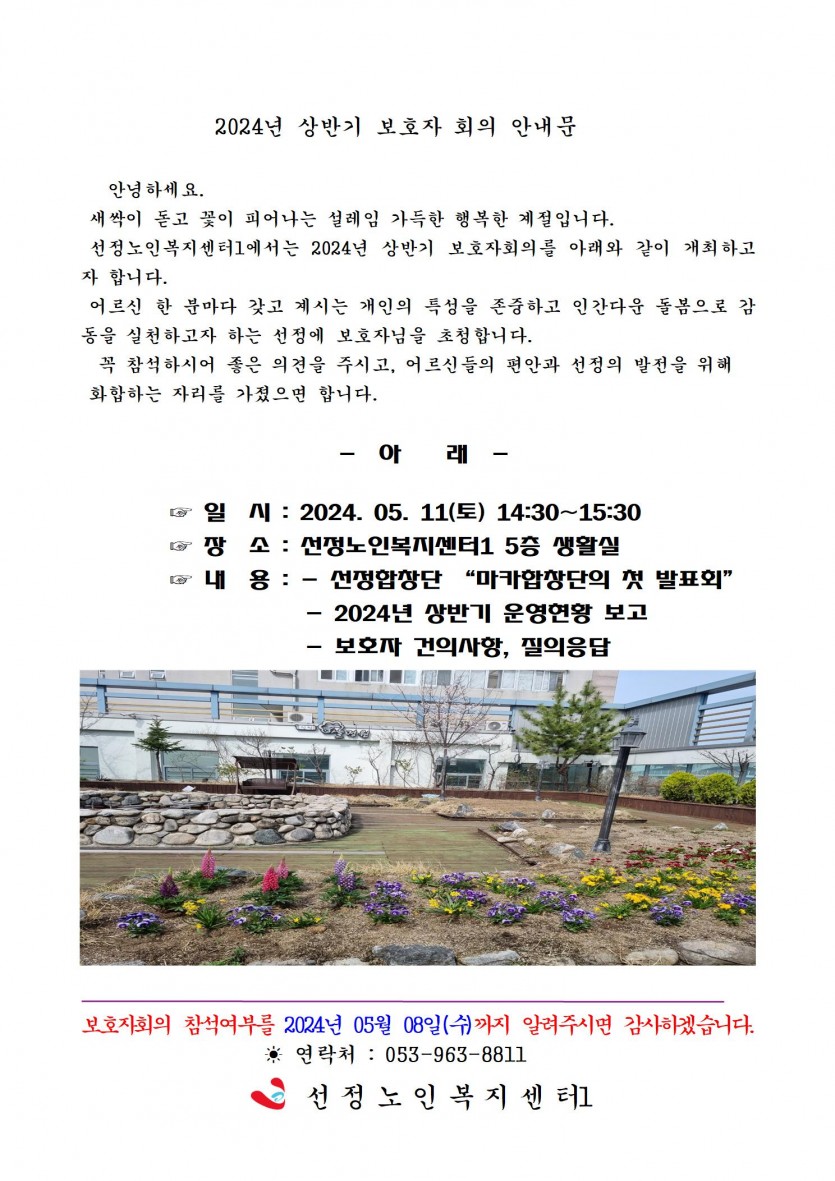 선정노인복지센터1에서는 2024년 상반기 보호자회의를 위와 같이 개최하고자 합니다.
