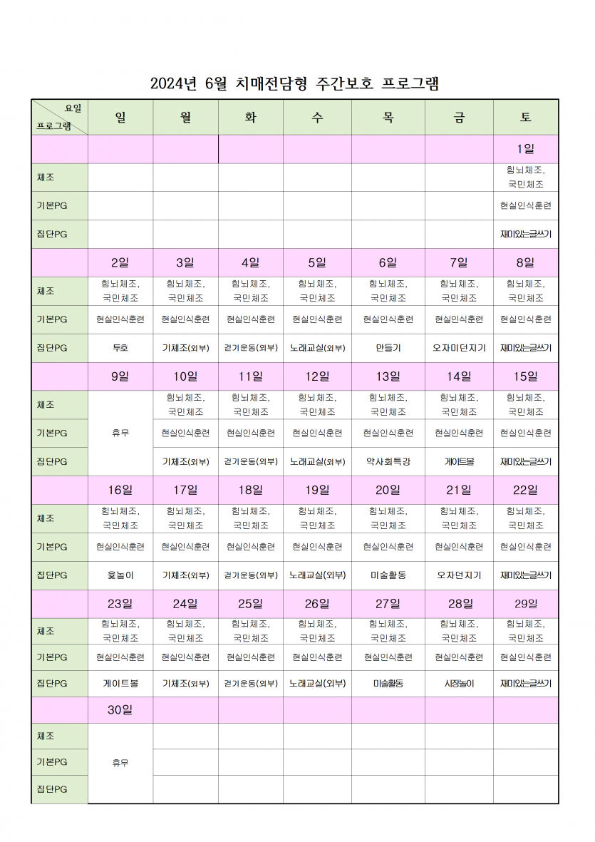 2024년 6월 치매전담실 프로그램 일정표 페이지 정보 작성자 최고관리자 댓글 0건 조회 2,291회 작성일 24-06-26 16:15 본문 . 목록 이전글2024년 7월 휴무일 안내 24.07.01 다음글2024년 6월 주야간보호 프로그램 일정표 24.06.01