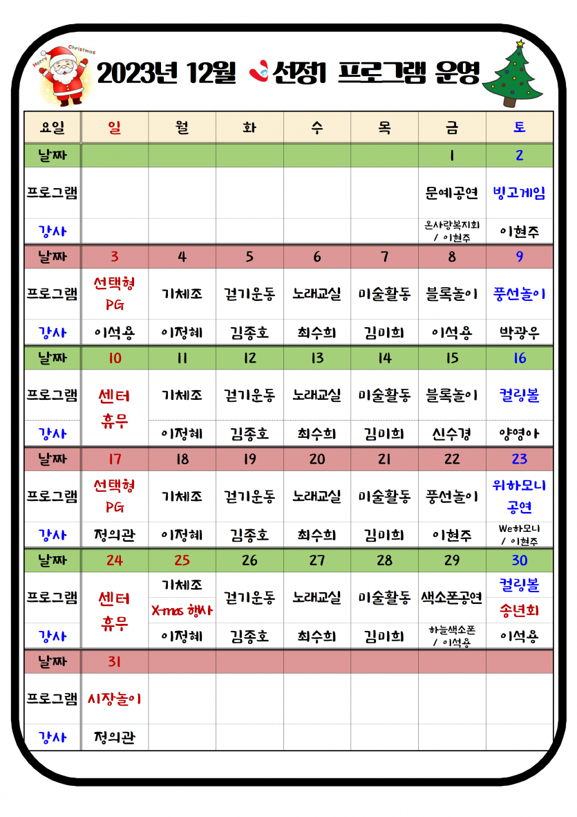 12월 주야간보호 프로그램 일정표 페이지 정보 작성자 최고관리자 댓글 0건 조회 2,152회 작성일 23-12-01 14:03 본문 12월 프로그램 일정표입니다. 목록 이전글12월 치매전담실 프로그램 일정표 23.12.01 다음글12월 소식지 및 식단표 23.12.01