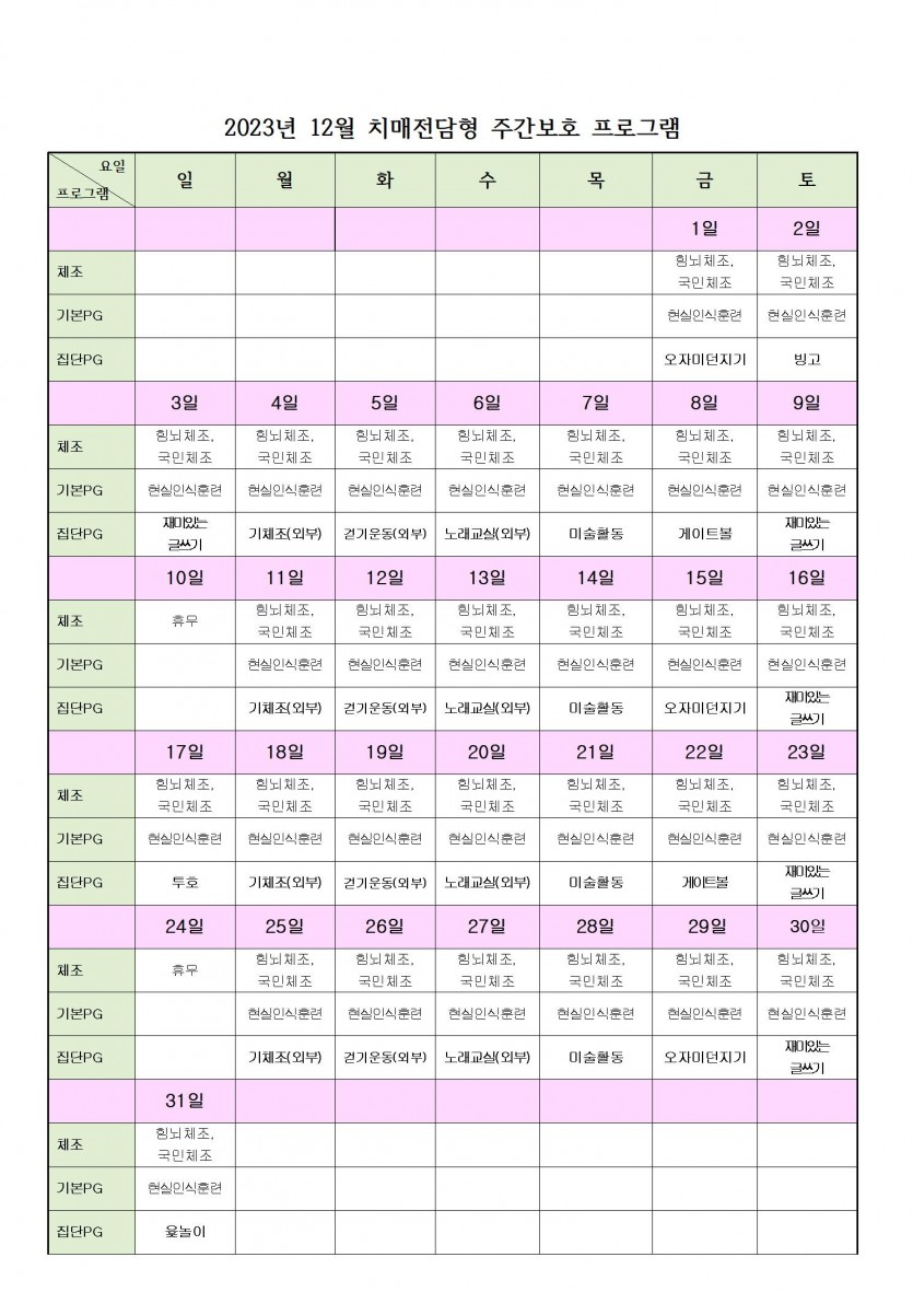12월 치매전담실 프로그램 일정표 페이지 정보 작성자 최고관리자 댓글 0건 조회 2,147회 작성일 23-12-01 14:05 본문 12월 치매전담실 프로그램 일정표 목록 이전글★중요★ 2024년도 수가변경으로 인한 주야간보호 본인부담금 변경 안내 23.12.01 다음글12월 주야간보호 프로그램 일정표 23.12.01