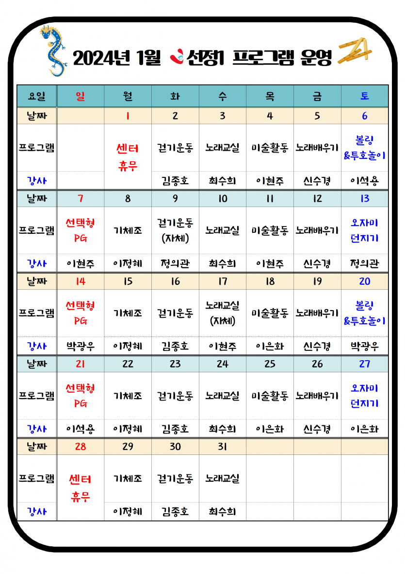 2024년 01월 주야간보호 프로그램 일정표 페이지 정보 작성자 최고관리자 댓글 0건 조회 2,181회 작성일 24-01-02 12:06 본문 1월 프로그램 일정표입니다. 목록 이전글2024년 01월 치매전담실 프로그램 일정표 24.01.02 다음글2024년 1월 소식지 및 식단표 24.01.02