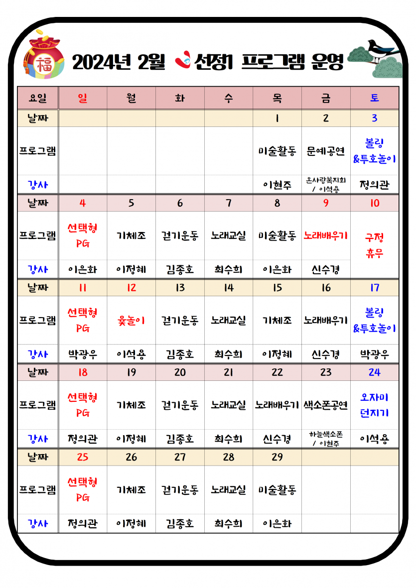 2024년 02월 주야간보호 프로그램 일정표 페이지 정보 작성자 최고관리자 댓글 0건 조회 2,196회 작성일 24-02-05 14:24 본문 2월 주야간보호 프로그램 일정표 입니다. 목록 이전글2024년 02월 치매전담실 프로그램 운영표 24.02.05 다음글2024년 2월 소식지 및 식단표 24.02.05
