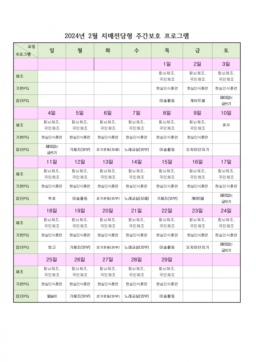 2024년 02월 치매전담실 프로그램 운영표 페이지 정보 작성자 최고관리자 댓글 0건 조회 2,180회 작성일 24-02-05 18:04 본문 치매전담실 프로그램 운영표 입니다. 목록 이전글2024년 3월 휴무일 안내 24.03.06 다음글2024년 02월 주야간보호 프로그램 일정표 24.02.05