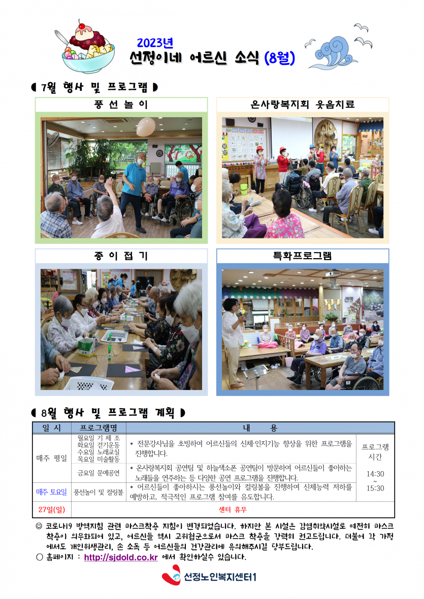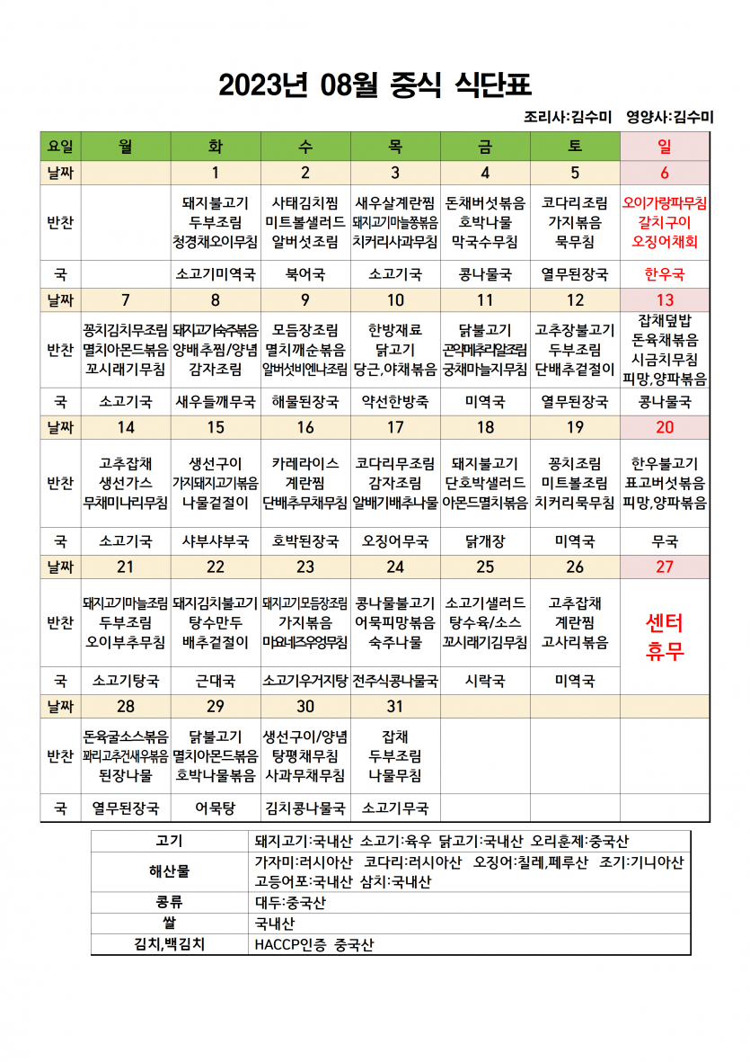 8월 소식지 및 식단표 페이지 정보 작성자 최고관리자 댓글 0건 조회 2,149회 작성일 23-08-01 13:38 본문 8월 소식지와 식단표 입니다. 목록 이전글8월 주야간보호 프로그램 일정표 23.08.01 다음글2023년 8월 휴무일 안내 23.08.01