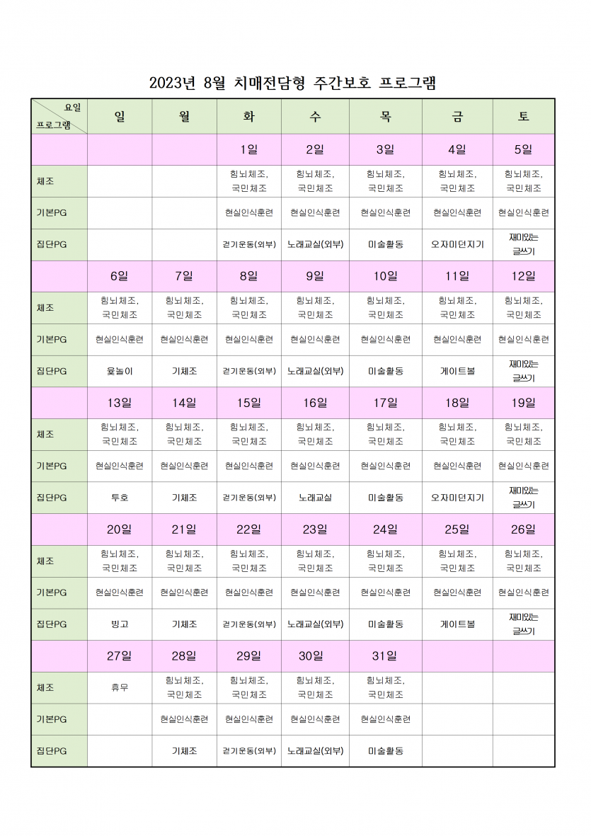 8월 치매전담실 프로그램 일정표 페이지 정보 작성자 최고관리자 댓글 0건 조회 2,232회 작성일 23-08-01 13:43 본문 8월 침매전담실 프로그램 일정표입니다. 목록 이전글2023년 9월 휴무일 안내 23.08.25 다음글8월 주야간보호 프로그램 일정표 23.08.01