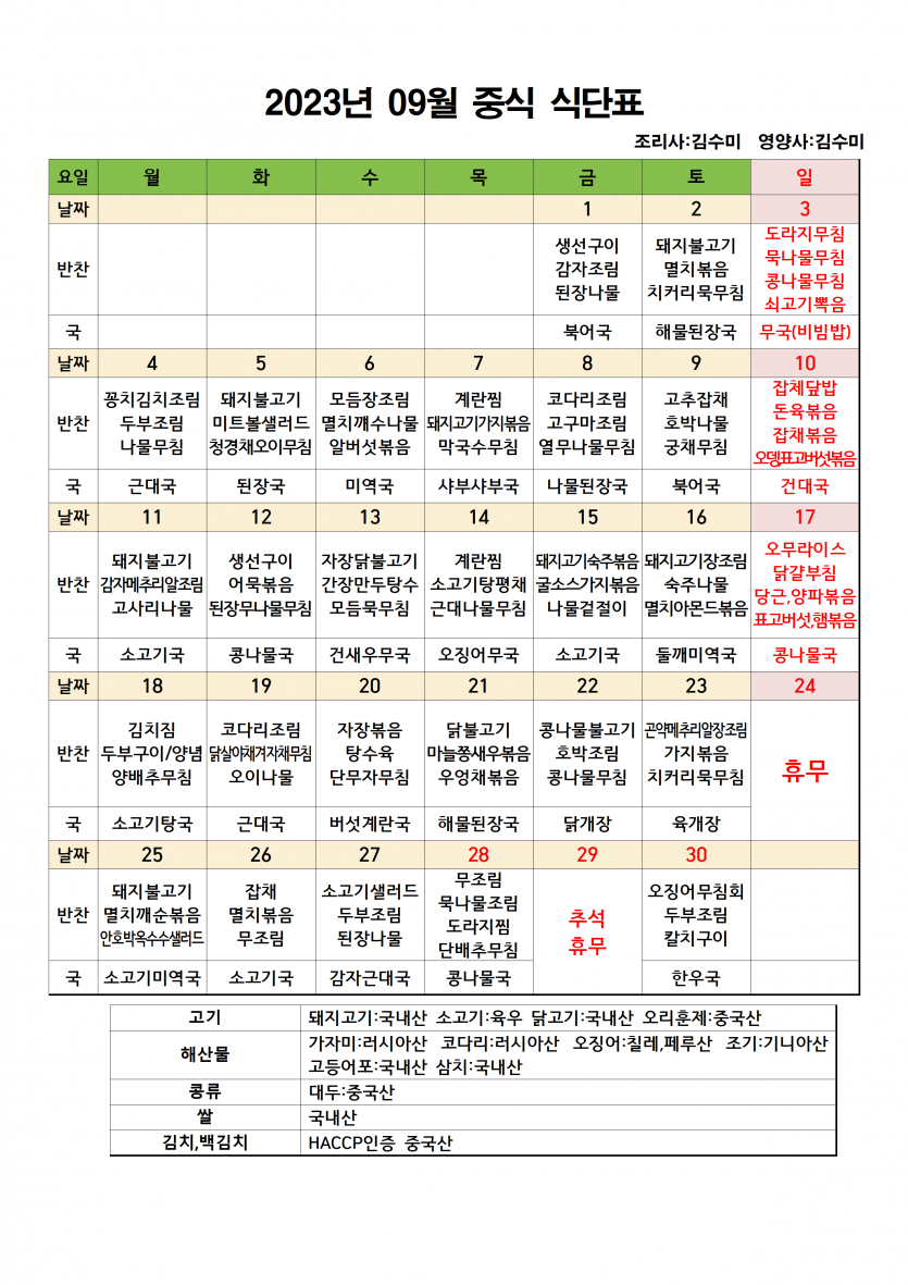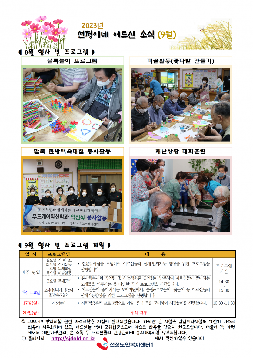9월 소식지 및 식단표 페이지 정보 작성자 최고관리자 댓글 0건 조회 2,128회 작성일 23-09-01 15:09 본문 9월 소식지 및 식단표 입니다. 목록 이전글9월 주야간보호 프로그램 일정표 23.09.01 다음글2023년 9월 휴무일 안내 23.08.25
