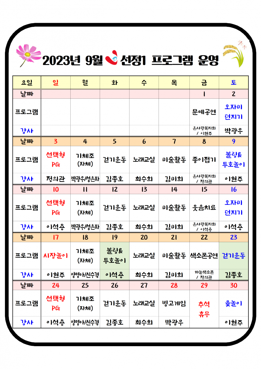 9월 주야간보호 프로그램 일정표 페이지 정보 작성자 최고관리자 댓글 0건 조회 2,221회 작성일 23-09-01 15:14 본문 9월 주야간보호 프로그램 일정표입니다. 목록 이전글9월 치매전담실 프로그램 일정표 23.09.01 다음글9월 소식지 및 식단표 23.09.01