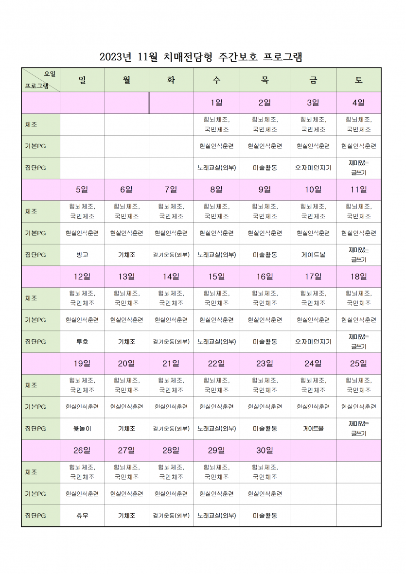 11월 치매전담실 프로그램 일정표 페이지 정보 작성자 최고관리자 댓글 0건 조회 2,184회 작성일 23-11-06 14:02 본문 치매전담실 프로그램 일정표입니다. 목록 이전글2023년 12월 휴무일 안내 23.12.01 다음글11월 주야간보호 프로그램 일정표 23.11.06