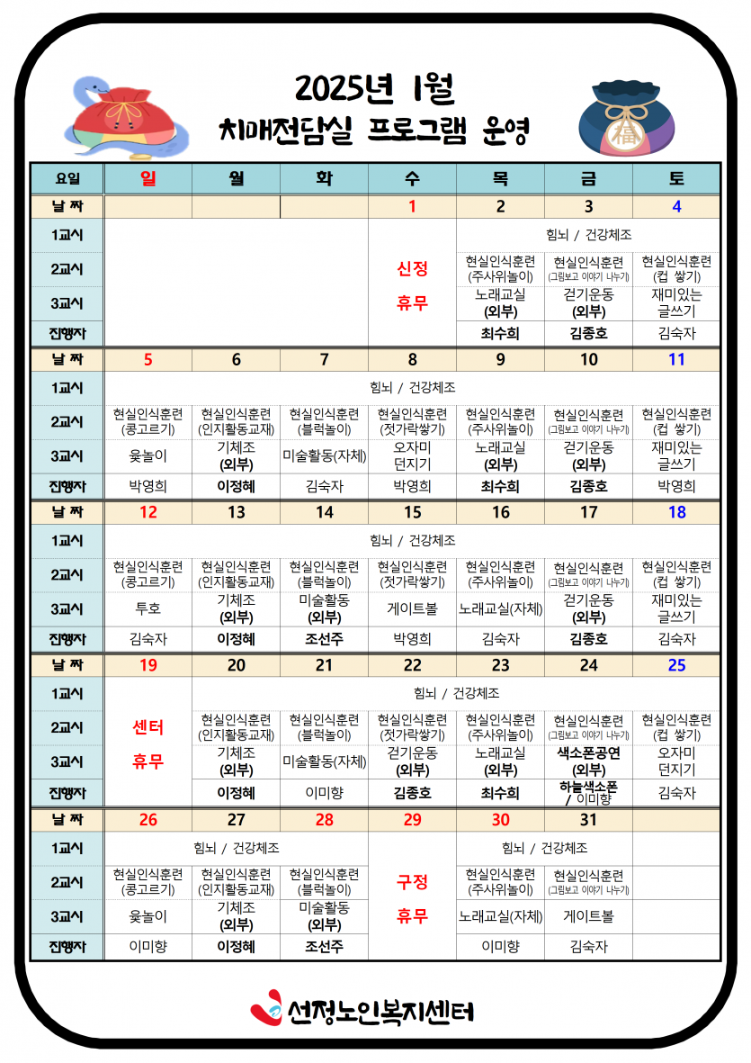 2025년 1월 치매전담실 프로그램 일정표 페이지 정보 작성자 최고관리자 댓글 0건 조회 1,064회 작성일 24-12-31 18:39 본문 2025년 1월 치매전담실 프로그램 일정표 입니다. 목록 이전글★중요★ 2025년도 수가변경으로 인한 본인부담금 변경 안내 25.01.20 다음글2025년 1월 주야간보호 프로그램 일정표 24.12.31