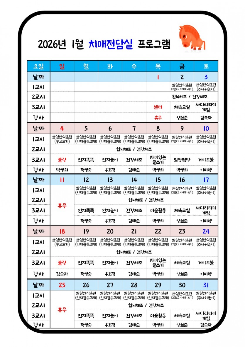 2026년 1월 치매전담실 프로그램 운영표 페이지 정보 작성자 최고관리자 댓글 0건 조회 238회 작성일 25-12-31 12:09 본문 * 2026년 1월 치매전담실 프로그램 운영표 목록 이전글2026년 1월 식단표 및 소식지 25.12.31 다음글2026년 1월 주야간 프로그램 운영표 25.12.31