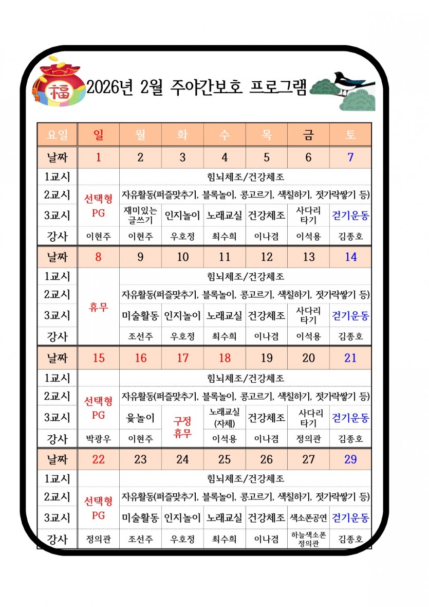 2026년 2월 주야간 프로그램 운영표 페이지 정보 작성자 최고관리자 댓글 0건 조회 190회 작성일 26-01-31 14:14 본문 2026년 2월 주야간 프로그램 운영표 입니다. 목록 이전글2026년 2월 치매전담실 프로그램 운영표 26.01.31 다음글2026년 1월 식단표 및 소식지 25.12.31
