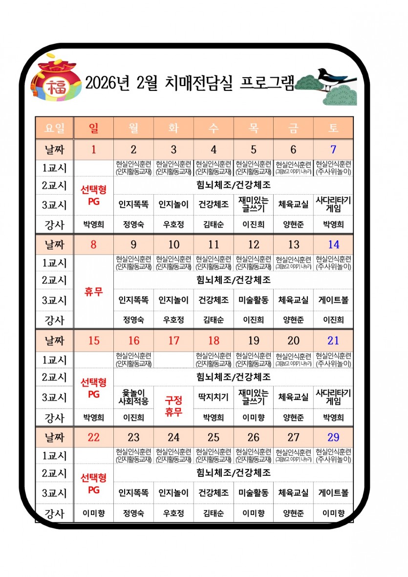 2026년 2월 치매전담실 프로그램 운영표 페이지 정보 작성자 최고관리자 댓글 0건 조회 220회 작성일 26-01-31 14:15 본문 2026년 2월 치매전담실 프로그램 운영표 입니다. 목록 이전글2026년 2월 식단표 및 소식지 26.01.31 다음글2026년 2월 주야간 프로그램 운영표 26.01.31