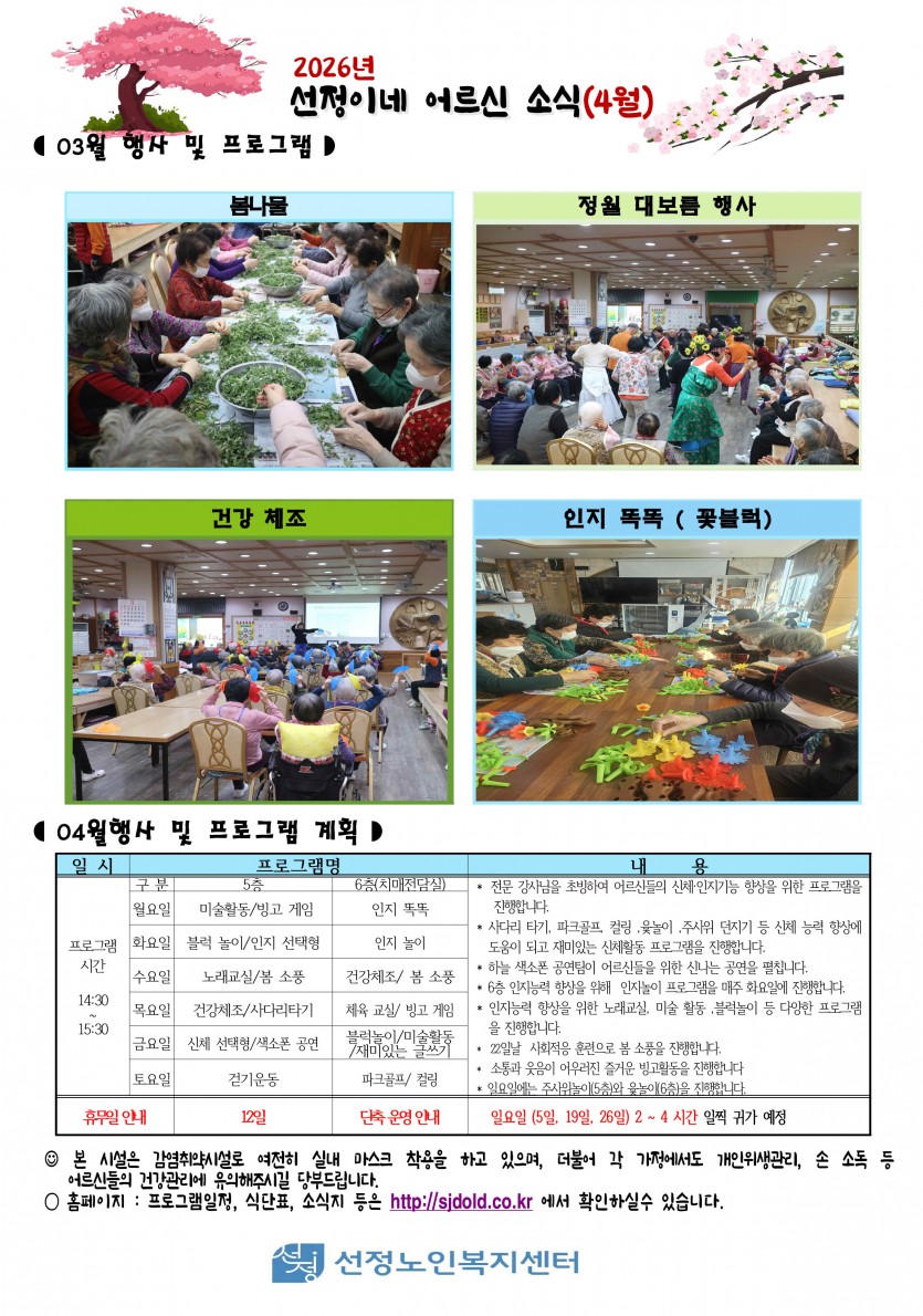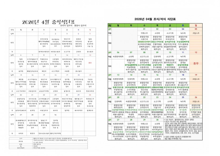 2026년 4월 식단표 및 소식지 페이지 정보 작성자 최고관리자 댓글 0건 조회 23회 작성일 26-03-31 14:57 본문 2026년 4월 식단표 및 소식지 입니다. 목록 다음글2026년 4월 치매전담실 프로그램 운영표 26.03.31